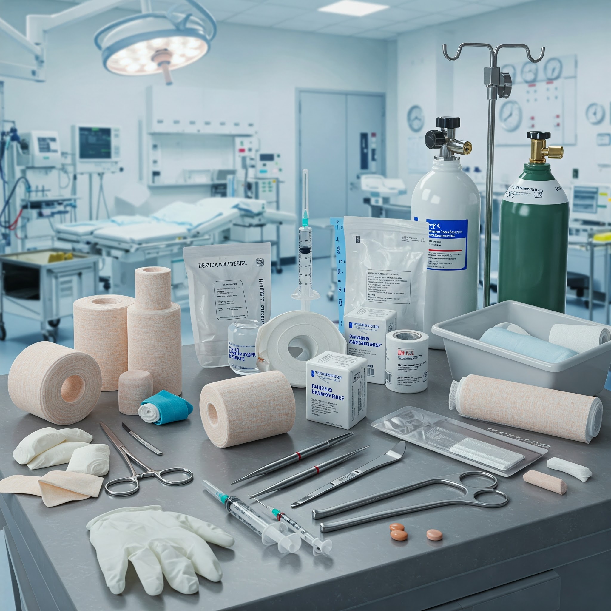 Gauze, bandages, stethoscopes, heart monitors, defibrillators, mobility aids, first aid kits, trauma kits, and more.